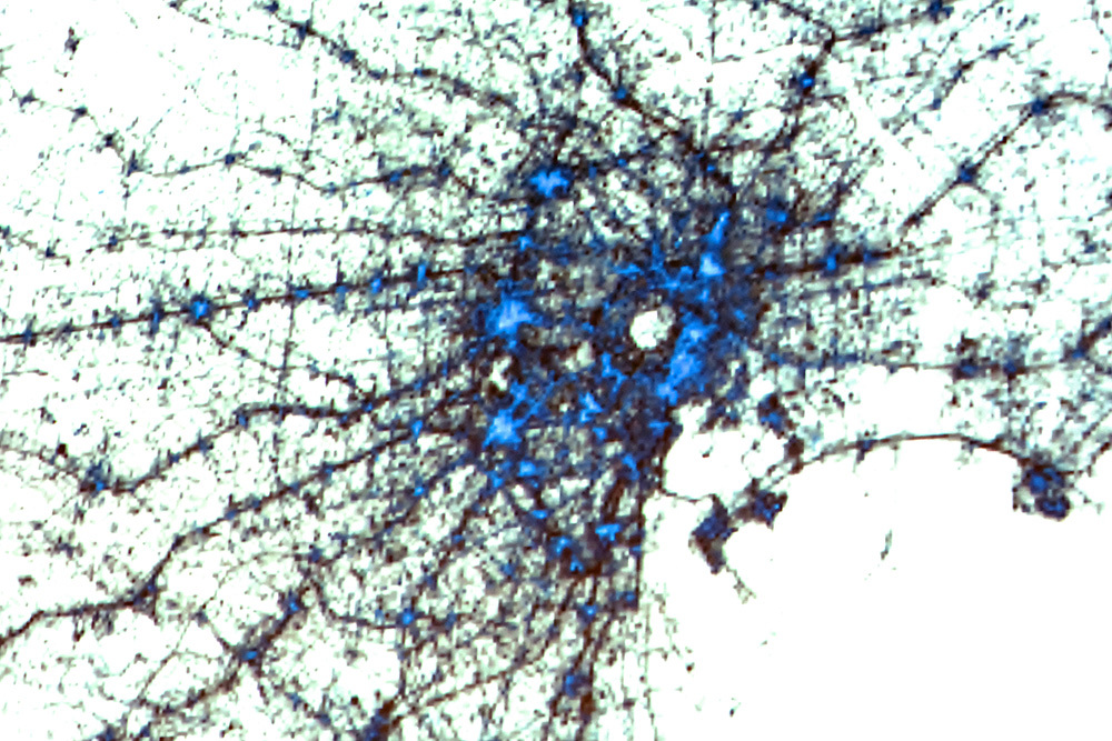 唐突ですが、この地図が何を示しているのか、皆さんお分かりになりますか? 東京近郊の鉄道路線図のようにも見えますね。実はこれ白地図にTwitterの発信をプロットしたものなんです。朝の時間帯で、まさに中央線や山手線などの線路に沿って盛んにツイートされていることが分かります。これは日本独自の現象で、例えばロサンゼルスでは住宅街のマッピングになります。世界地図にマッピングすると大事件が発生した時は、そこが赤くなることが分かります。日本では年末年始に年賀のメッセージが大量にツイートされるため、アメリカのメンバーは休日返上で日本のサーバーが落ちないようにメンテしています。それほど日本では盛んにTwitterが使われています。