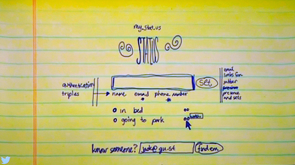 これはTwitterの原型をノートに描いたものです。真ん中にサーチボックスがあるシンプルなものです。ツイートではなく今のステータスを発信するためのUIですね。これが世界中で3億人、日本では4500万の月間アクティブユーザーがおりますが、人口比率で言えば世界で最も使われている国が日本なんです。