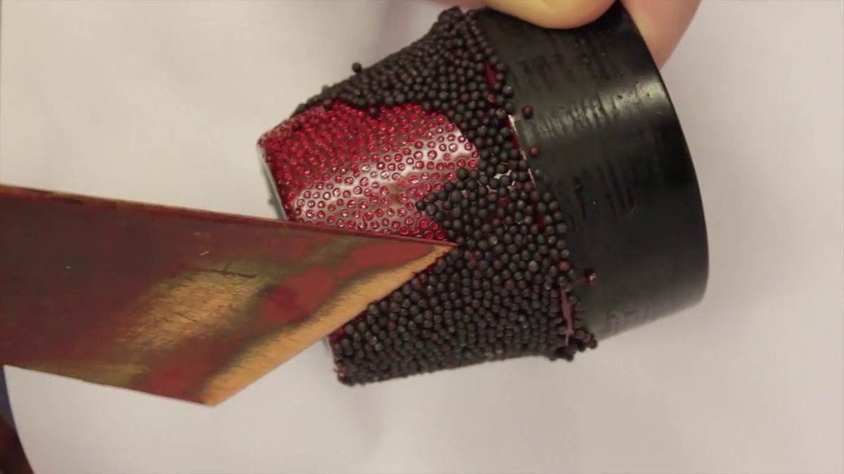 初めて目にしたときは、「な、なにこれ……?!」と、思ったが、この丸い輪の正体を職人さんに聞くと、菜種だというからびっくり。家庭でよく使われる菜種油の原材料、菜種がこんなアートを生み出した張本人なのである。多くは青森県の横浜で栽培されている。津軽塗りは、何度も漆を塗り重ねて研ぎ出して作られるのが特徴である。漆を塗った後に、漆が乾くか、乾かないかの絶妙な頃合いを見計らって、菜種を前面に撒くのだ。そして、乾ききる前に菜種油を木べらで剥ぎ取る。