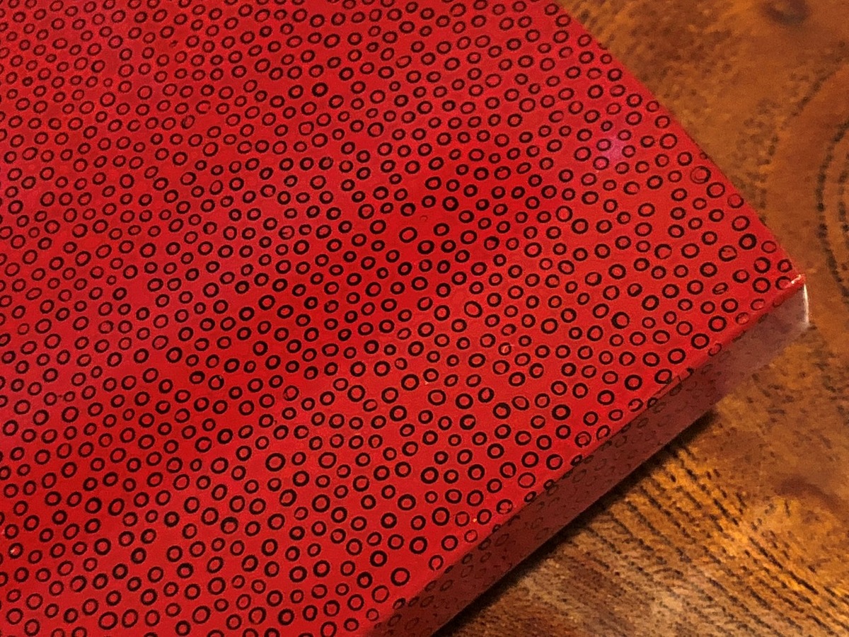 すると凹凸が生まれる。その上に赤い漆を塗り、研ぎ出すと凹凸によってこのようなアートが生まれるのだ。この丸い輪、和えるで作っている『青森県から 津軽塗りの こぼしにくいコップ』よりも輪の大きさが大きいなぁと思い、職人さんに聞いてみたら、年代物なので昔の菜種を使っているからだろうとのこと。