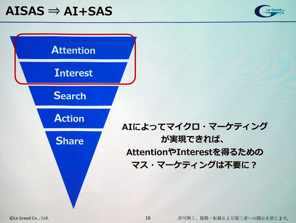 マーケティングの手法にアイサス(AISAS)と呼ばれものがあります。これは電通が考えたのですが、Attention、Interest、Search、Action、Shareの順番で世の中に製品が売れていくという考え方です。いままで、注意をひいて、興味を持ってもらうAIの段階には莫大なコストがかかるマスマーケティングが必要というのが常識でした。しかし、ある程度のデータがあって、マイクロマーケティングができれば、それが不要になるかもしれません。 Attention、Interest のAIの部分が人工知能のAIに置き換わるかもしれないのです。