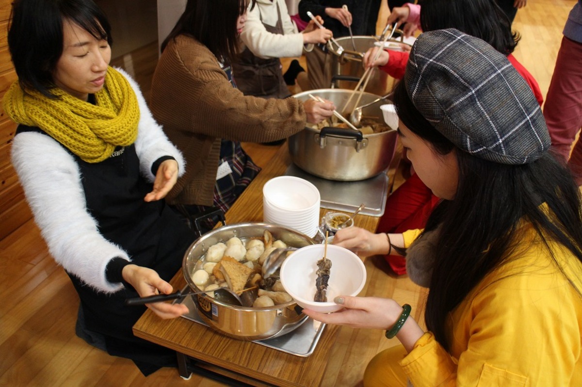 とくに地元の赤郷地区の方々が公民館で準備された宴会では、秋祭り伝統の神楽披露から餅つき、美祢の地酒に地域のお母さんたち心尽くしの郷土料理でもてなされ、特産の美東ごぼう入りのおでんには、根菜を使った日本の料理に馴染みのない若い留学生たちも「おいしい!」を連発、地域の方々とも交流が持て、今回のプログラムの中でとりわけ好評だった。しかし地域の側からすれば、たまのお客さんだからこういった歓待も可能かもしれず、農家の繁忙期であればそれどころではないだろうし、これらの体験を定期的なツアー商品として組み込むのは容易いことではないだろう。