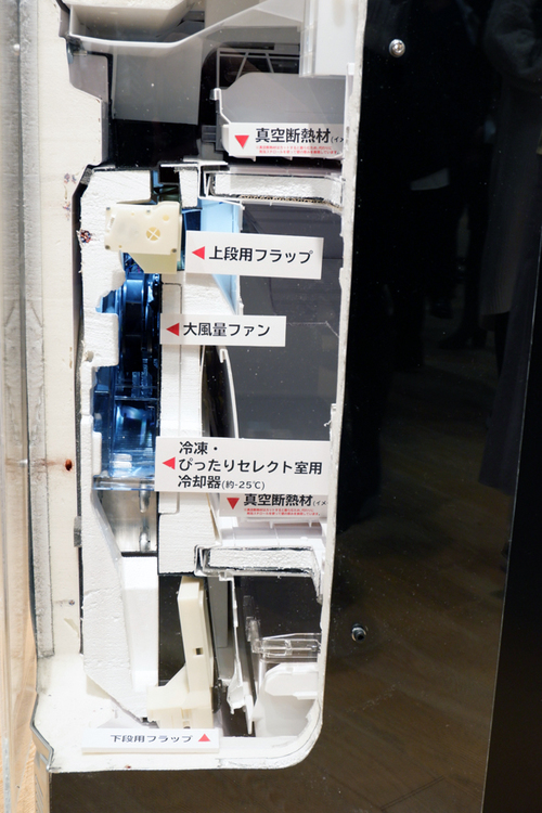 大容量ファンの場合、前後にそれなりのスペースを設け、空気が移動できるようにしなければなりませんが、その場合、庫内容量が犠牲になります。このためファンの横方向から風を流すようにしました。そして「薄型断熱材」できっちり仕切り温度制御します。薄型断熱材は、庫内容量を大きくするため数年かけて開発、導入した技術ですが、ここでも大きな役割を果たします。