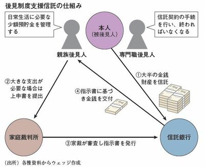 多額の財産や不動産があり財産管理が難しい事例や、親族間の紛争が見込まれる場合、家裁は専門職を後見人に選任してきた。専門職は不祥事を犯せば免許剥奪などの処分があるので、親族よりは自制心が働く。しかし専門職は報酬が必要なのである程度の資産を持つ場合でないと選任できない。昨今の家族機能の低下もあって、後見人を引き受ける親族の比率は年々下がっている。このままだと専門職の確保が難しくなる。ある程度の資産がある場合も親族に引き受けさせ、かつ不正を起こさせないためには、大部分の資産を凍結すればよい。そこで「信託」の概念が持ち出されたわけだ。