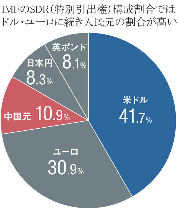 人民元を基軸通貨と呼ぶにはまだまだ程遠い。しかし、中国政府はこれまで人民元クロスボーダーの貿易決済を拡大、その後直接投資やポートフォリオ投資における人民元利用のルートを拡大してきた。また人民元の利用を促すための国際協力も進めており、海外中央銀行との通貨スワップ協定に加えて、一部中央銀行は人民元を外貨準備に加えている。また、16年10月からはIMFのSDR(特別引出権)の構成通貨に採用されている(右図)。コモディティの元建て取引も開始されており、少しずつだが、国際取引通貨への足取りを進めているようにもみえる。