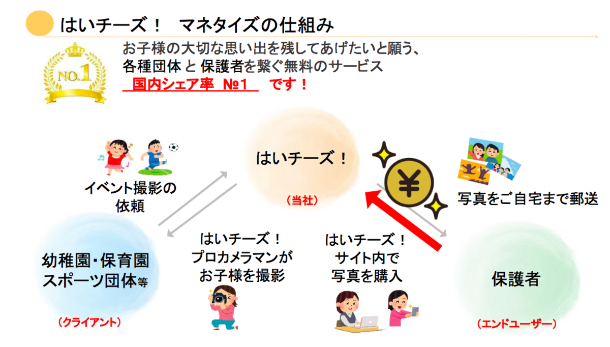 現在は6000団体へカメラマンを派遣し「写真・動画」とITを組み合わせ、購入者の「記憶」領域へアプローチし、たくさんの笑顔やコミュニケーションの創出場面に立ち会っています。