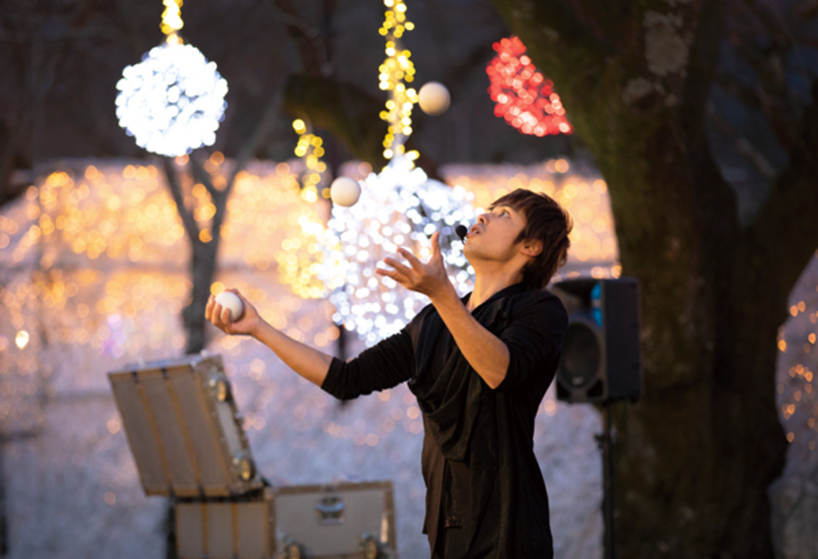 夕陽が沈み、イルミネーションが点灯された御殿場高原の総合レジャー施設・時之栖(ときのすみか)。家族連れの姿が目立つ休日のイベントスペースでは、細長い何色もの風船を器用にねじりながらワイヤレスマイクで通り過ぎる人々に呼びかける若い大道芸パフォーマーがひとり。プロとして静岡を中心に活動しているジョー次である。たまたまその場を通りかかっただけの人の足を止めることができるか。ジョー次の勝負はすでに始まっている。