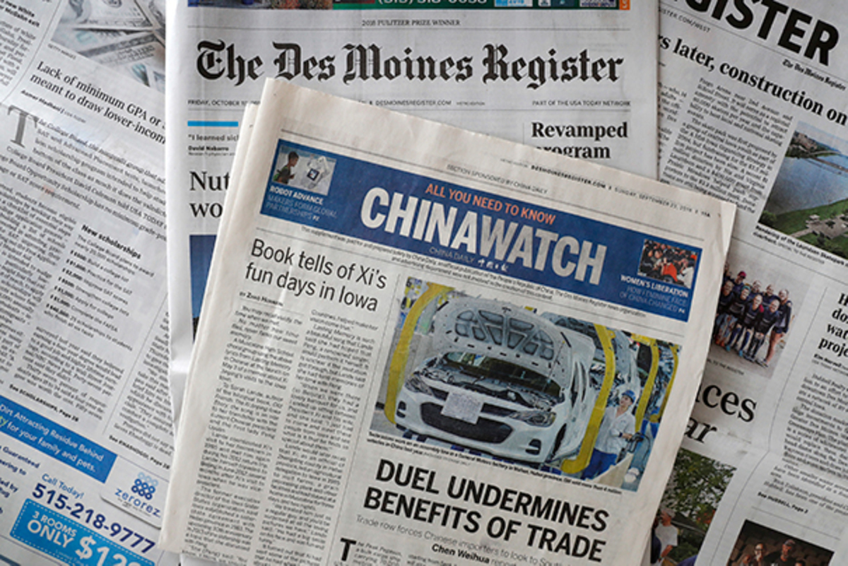 米中貿易で両国が一段と対立を深めていた2018年9月27日、突然、米国の中西部にあるアイオワ州の有力紙「デモイン・レジスター」に、「チャイナ・ウォッチ」と書かれた4ページにおよぶ広告が折り込まれ、店頭に並んだ。中国政府系英字紙を発行するチャイナ・デイリー社が、デモイン・レジスターに、トランプ大統領を批判する広告記事を掲載したのだ。広告は、「チャイナ・デイリーが執筆し、広告費用を負担した」というデモイン・レジスターの但し書き付きだ。