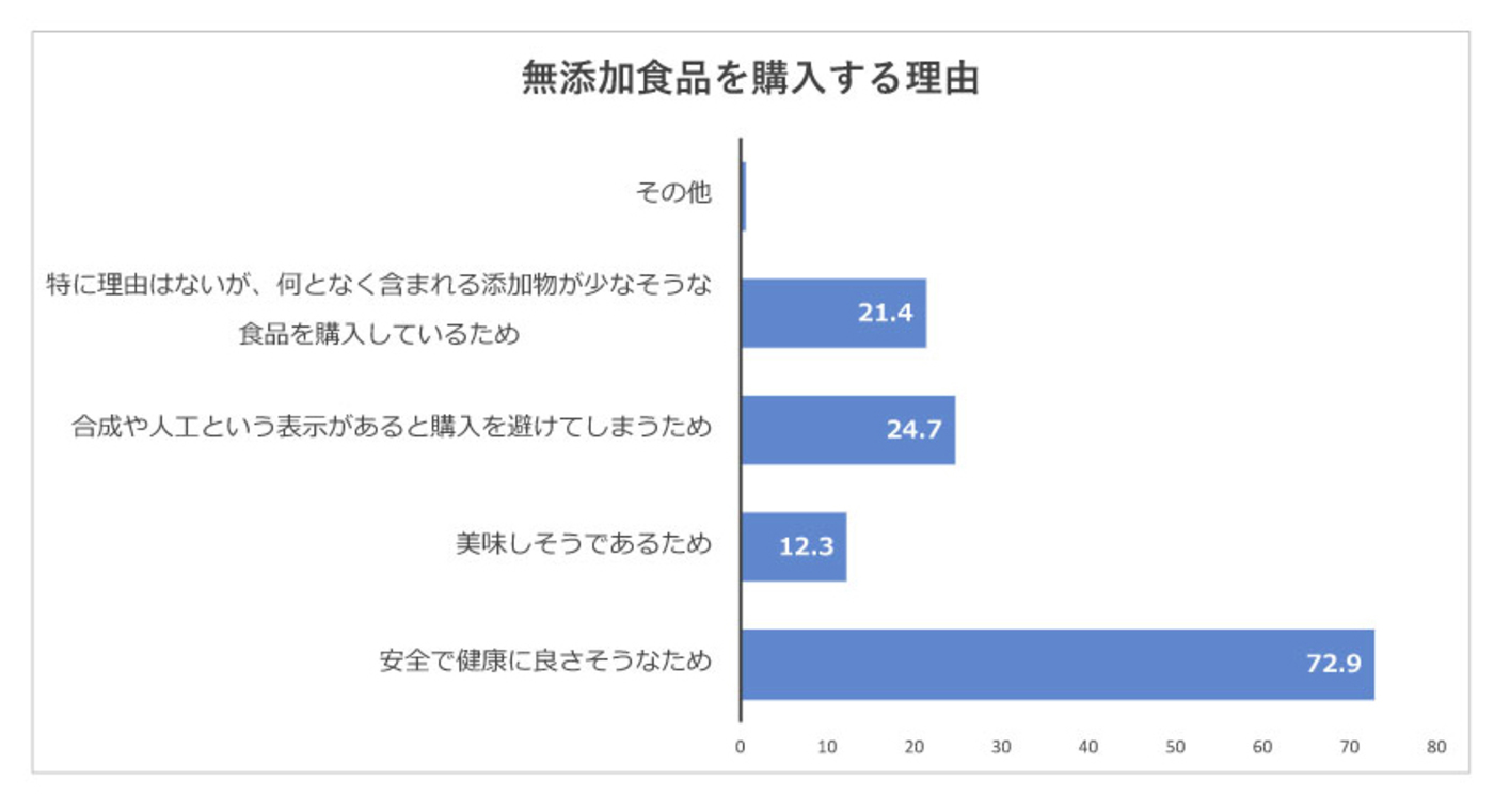 しかし、消費者は誤解しています。消費者庁の行っている「食品表示に関する消費者意向調査」によれば、無添加等の表示のある食品を購入している割合は過半数を超えました。その理由として、7割以上の人が「安全で健康に良さそうなため」と答えています。