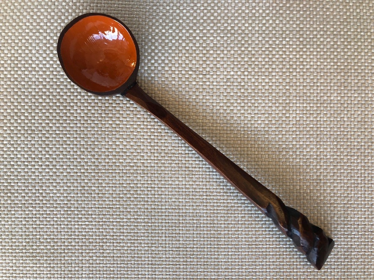 木は軽いので鍋に沈まないことから、「浮上お玉」とも言われている。拭き漆で塗装されたこのお玉と出会ってから、ずっと使い続けている。