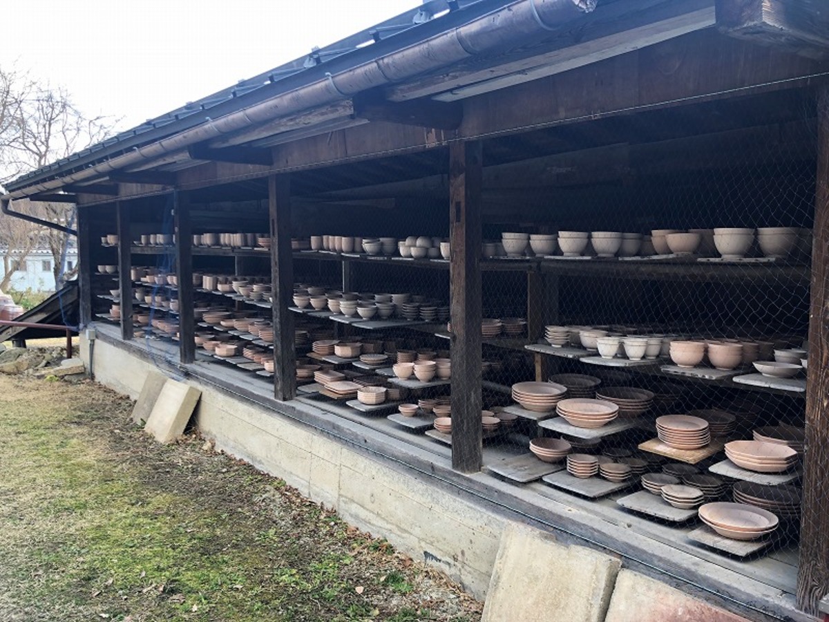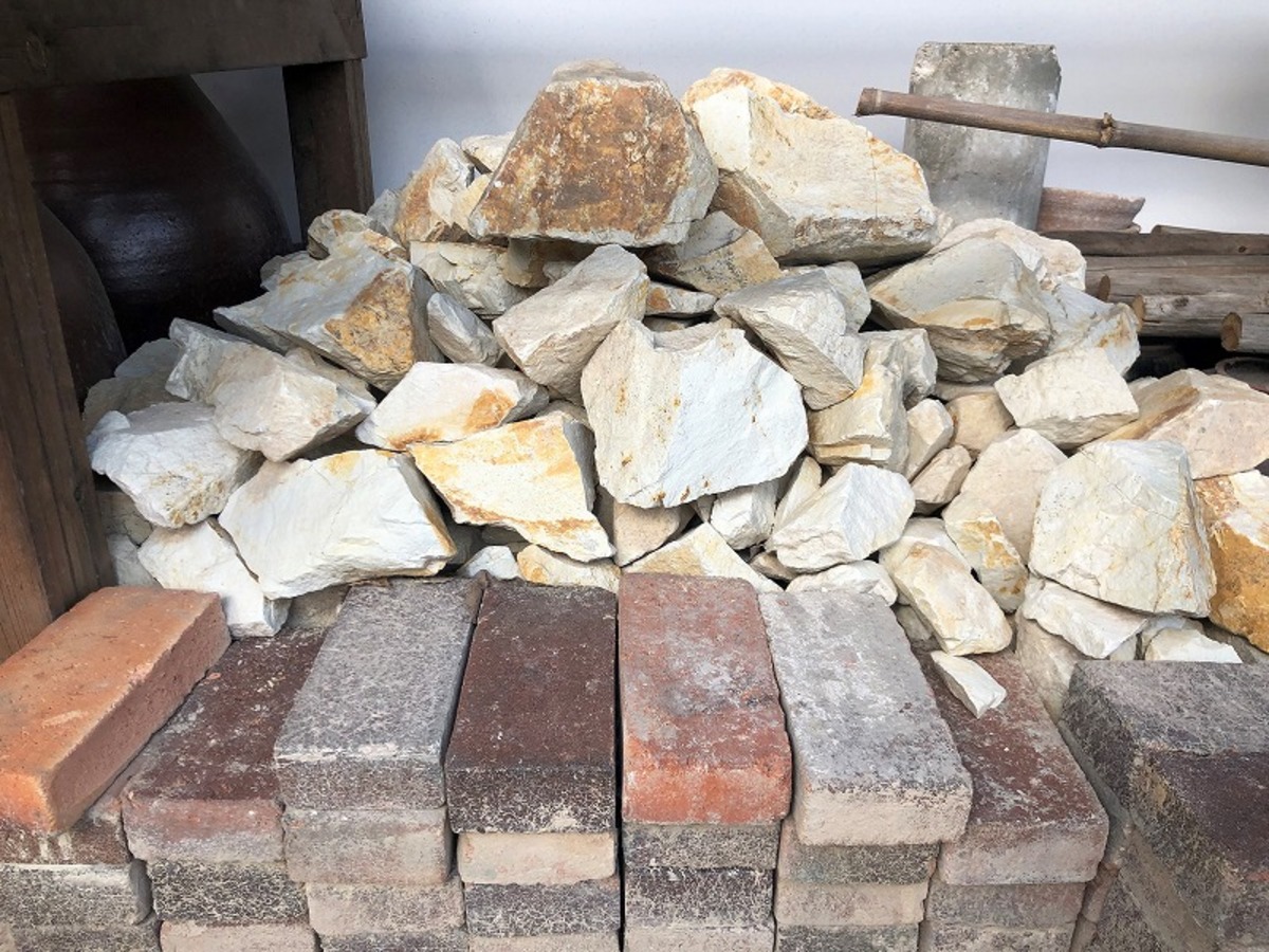 渋草焼を作るのに使っていた陶石も庭先に置いてあった。まだ陶石は山に残っているものの、今では、地元での採掘をする会社がなくなり、残念ながら地元材は手に入らなくなってしまったそうだ。そこで、限りなく近い性質の原材料を探し求め、熊本の天草陶石を取り寄せて使っているとのことであった。