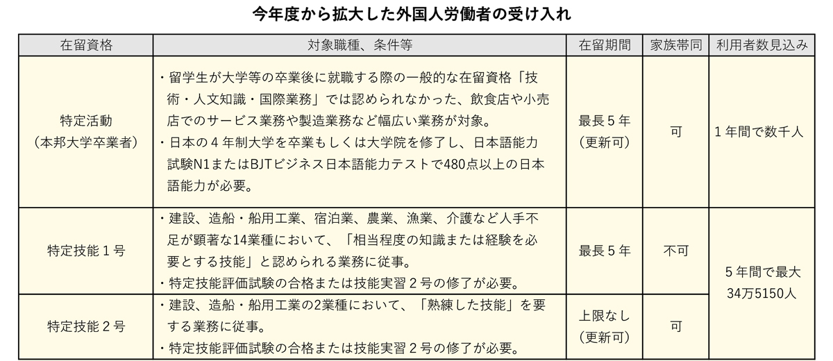 ただし、これはあくまでも一定の専門性等を有する人材であって、未熟練労働者や移民一般の受け入れを認めたものではない。とはいえ、その専門性等に関しては従来の「高度人材」受け入れとは一線を画し、技能実習制度を修了した労働者に関しても対象にするということから、専門性等の定義は非常に曖昧なものとなっている。18年12月には出入国管理法等の改正が行われ、この4月から介護や外食、農業、建設など14業種において今後5年間に34万人程度の特定技能1号、2号による外国人材受け入れが始まった。