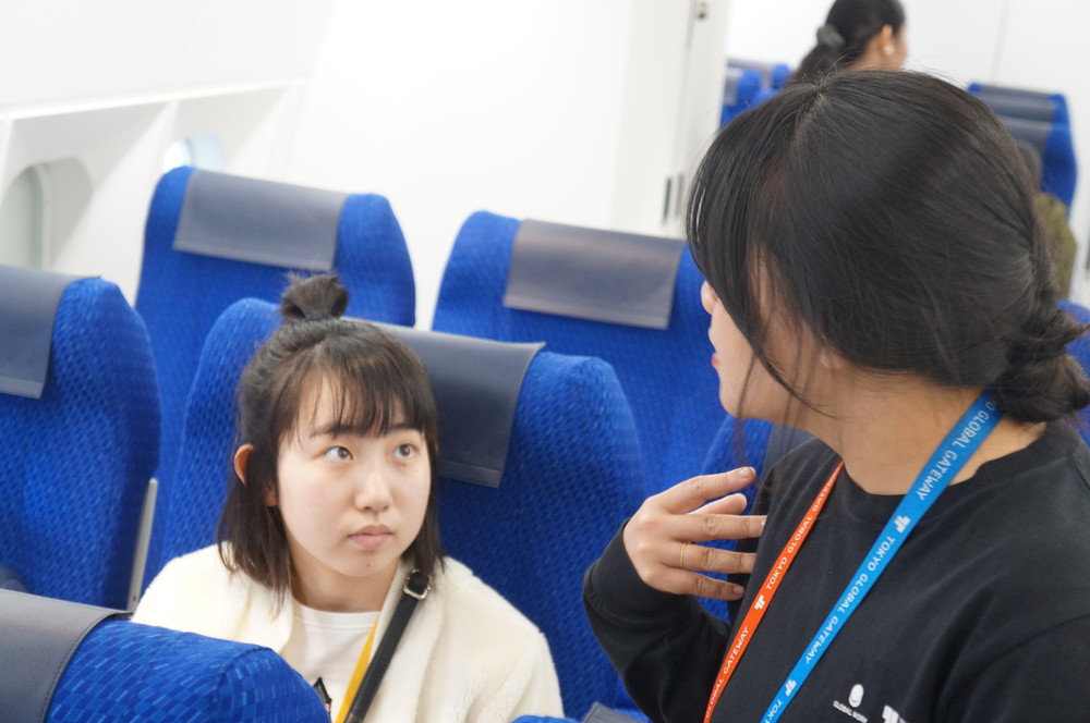 フライトアテンダント以外にもスタッフおり、が生徒に「What country do you want to travel ?(どの国に旅行したいですか?)」と聞くと、生徒が行きたい国の名前を答える。国の名前が答えられた生徒には、「なぜ、その国に行きたいですか?」と、少し難しい質問を投げかけるなど、様々な会話が経験できる。