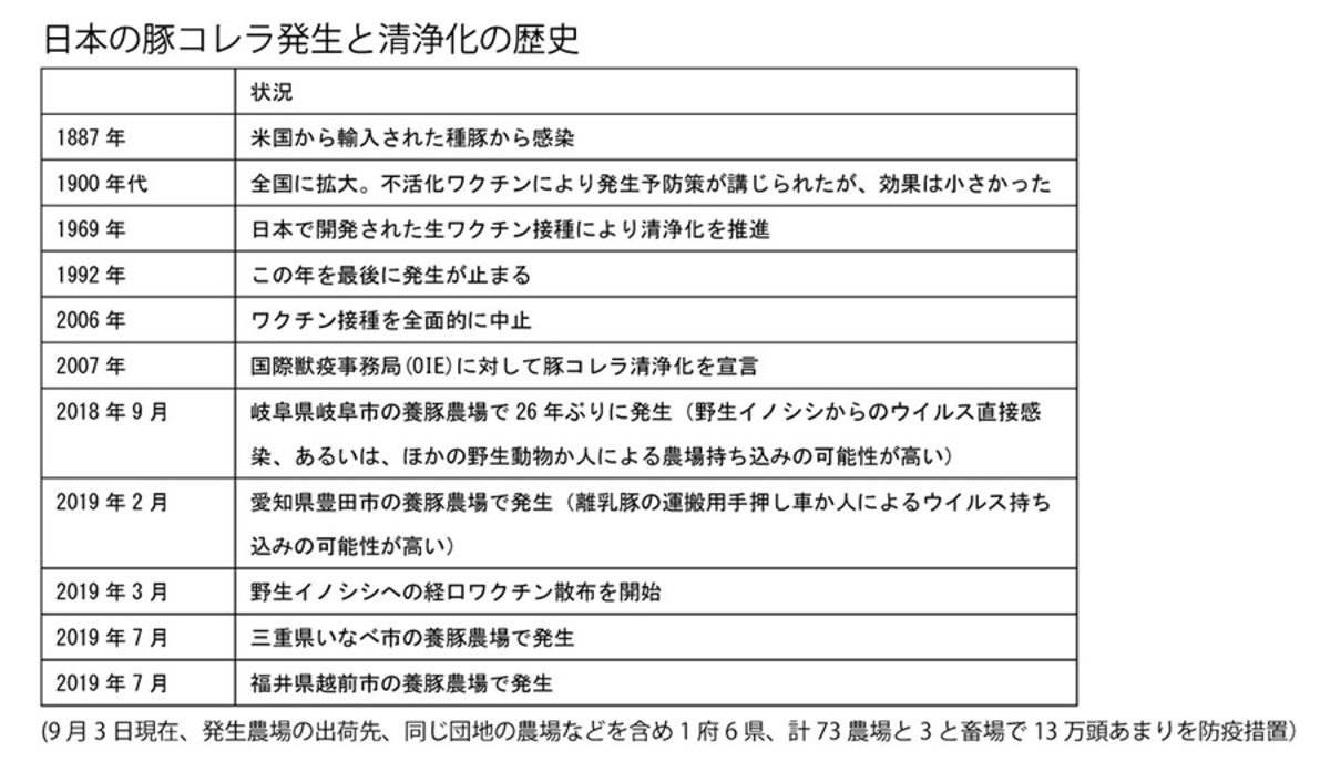 昨年9月9月、岐阜県の養豚農場で確認されたのを皮切りに愛知県、三重県、福井県など計39農場・研究所で感染が確認され、関連農場等も含め1府6県で豚13万頭あまりが処分されています(9月3日現在)。