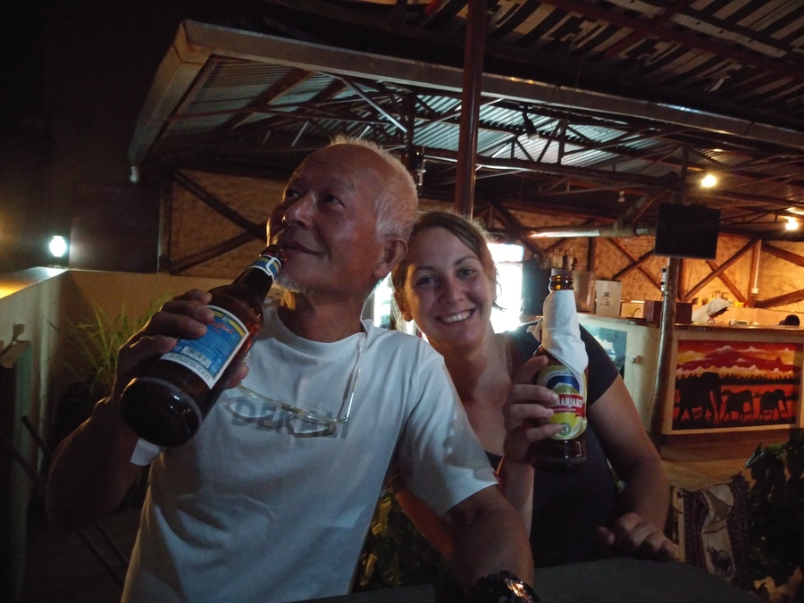 1週間ぶりでシャワーを浴びて、おじさん三人組はご機嫌で屋上テラスでビールを飲んだ。少し離れたテーブルで素敵な欧米女子が一人で夕景色を眺めていた。声を掛けたら「一緒にビールを飲みましょう」とおじさん三人組にジョイン。
