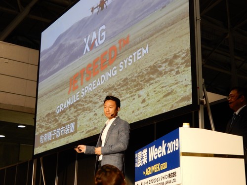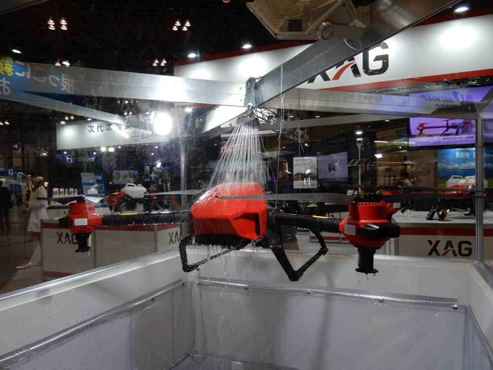 ブランドカラーの赤いドローンにシャワーで容赦なく水が浴びせられる。国内最大の農業生産資材の展示商談会「農業Week」でXAIRCRAFT JAPANのブースを訪れ、その大きさと真ん中に据えられたショーケースに驚いた。10月9~11日に幕張メッセで開催された農業Weekでは、中国系企業の出展の多さが目に付いた。その中でも同社のブースは断トツの広さ。バイエルと共同の出展だったこともあるけれども、日本市場への本気度を表すものだと感じた。