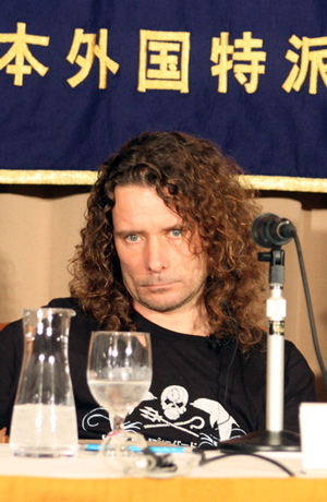 2月24日、都内の日本外国特派員協会で行われた記者会見。ソバージュ風の長髪男性が厳しい表情をして、集まった各国メディアの東京特派員に訴えた。