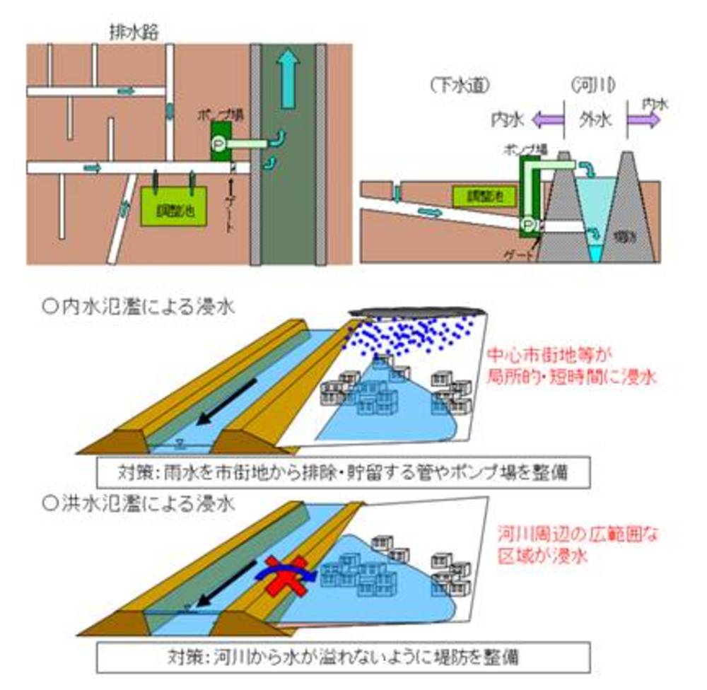 現在の整備目標は、これまで最大の降雨でも床上までは浸水しないことだ。そのためには排水能力を強めるとか、雨水の調整池や貯留池を設けることなどが求められる。