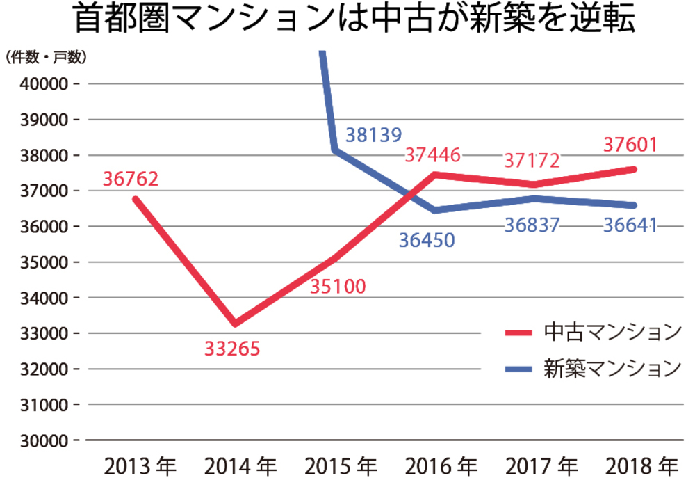 首都圏において2016年から18年まで3年連続で中古マンションの契約件数が新築を上回ったことは、不動産・住宅業界に新しい流れが生まれたことを印象付けた。5年ほど前までは新築志向が強かったが、首都圏のマンション価格がこの数年で急騰した反面、所得の伸びがそれに追いつかなかったことから、新築から中古ヘのシフトがみられるようになった。