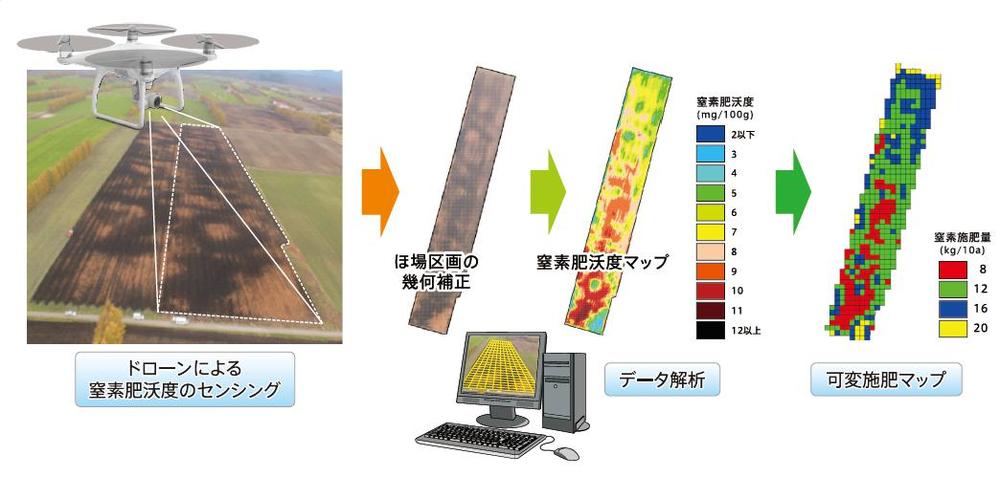 農家に作物と肥料の成分を設定してもらい、散布量を色分けした可変施肥マップを作成し、農家にデータを渡す。農家はGPSが受信できるトラクターで可変施肥ができる施肥機を牽引し、マップに基づいて適切な量の肥料をまく。