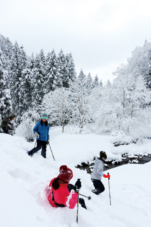 真冬は一面雪に覆われ、白銀の世界となる美山町。その魅力を存分に満喫できるツアーが、宿泊施設「美山町自然文化村 河鹿荘(かじかそう)」が冬季限定で開催する「美山スノーシューハイク」だ。