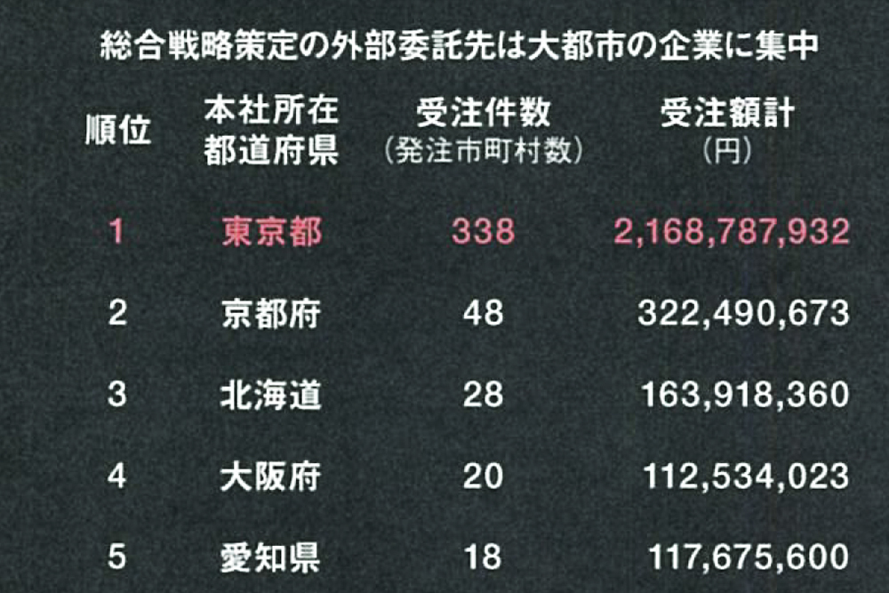 そして、その受注額、受注件数ともに東京都に本社を置く機関が全体の5割以上のシェアを占めていた。総合戦略の策定に際しては、国から各自治体に1000万円ずつ予算措置が行われているが、地方創生のための予算まで東京一極集中となっているのは何とも皮肉だ。