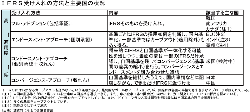日本も、11年6月の自見庄三郎金融相による談話で、15年3月期のIFRS強制適用を否定し、仮に強制適用する場合でも、5~7年程度の十分な準備期間を設定するとした。