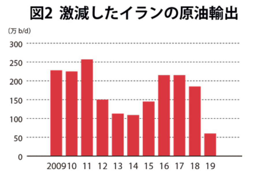 また、昨年5月にトランプ政権が発動したイラン産原油の輸入を一切禁じる制裁は、イランの原油輸出量を前年の約3割程度まで激減させた(図2)。さらに昨年12月の時点では、約25万バレル/日と制裁前の1割まで落ち込ませた。原油輸出収入の減少を受けて財政は逼迫し、開発予算は執行に至らず、雇用創出も追いつかず、大学を出ても職につけない若者の数も増えている。