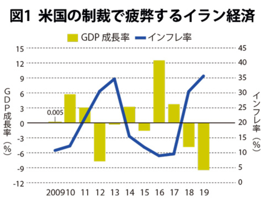核合意の破棄を宣言するトランプ大統領が17年1月に就任すると、イラン国民の間では先行きへの不安が高まり、保有資産を外貨に換える動きが加速した。その結果、イランの通貨リアルの価値は暴落し、米国の経済制裁強化に伴い貿易自体が困難になるなか、諸々の調達コストは増大し、物価も上昇を続けた(図1)。また、「米国かイランか」の二者択一を迫るトランプ政権の強力な二次制裁は、多くの外国企業をイランから撤退させ、その結果失業率も上昇した。