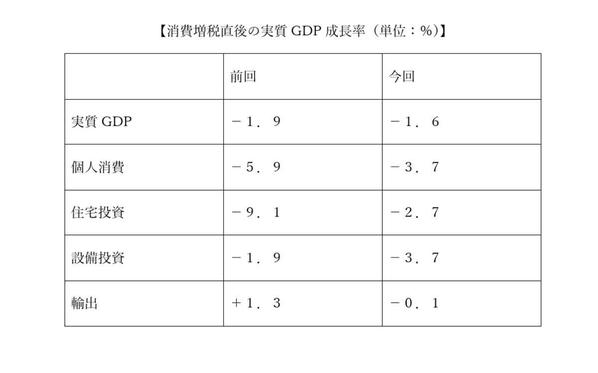 個人消費の落ち込み幅は、今回の方が小さくなっています。増税幅が小さかったこと、軽減税率が適用されたこと、ポイント還元制度などが採用されたこと、などが寄与したのでしょう。