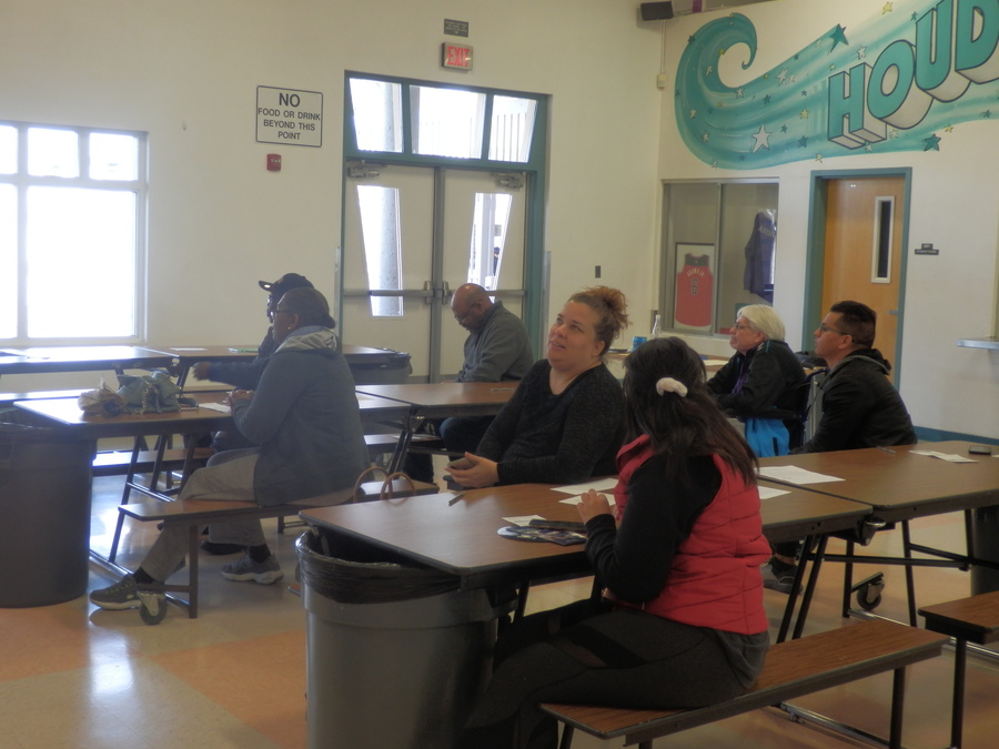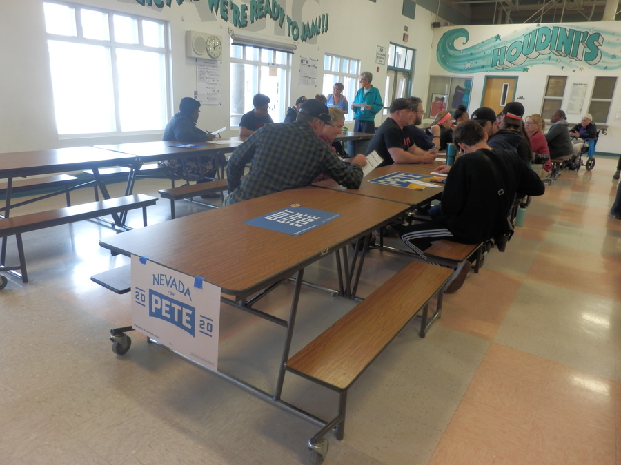 モラスキー中学校のカフェテリアに集まった有権者は、支持する候補のテーブルに座ります。