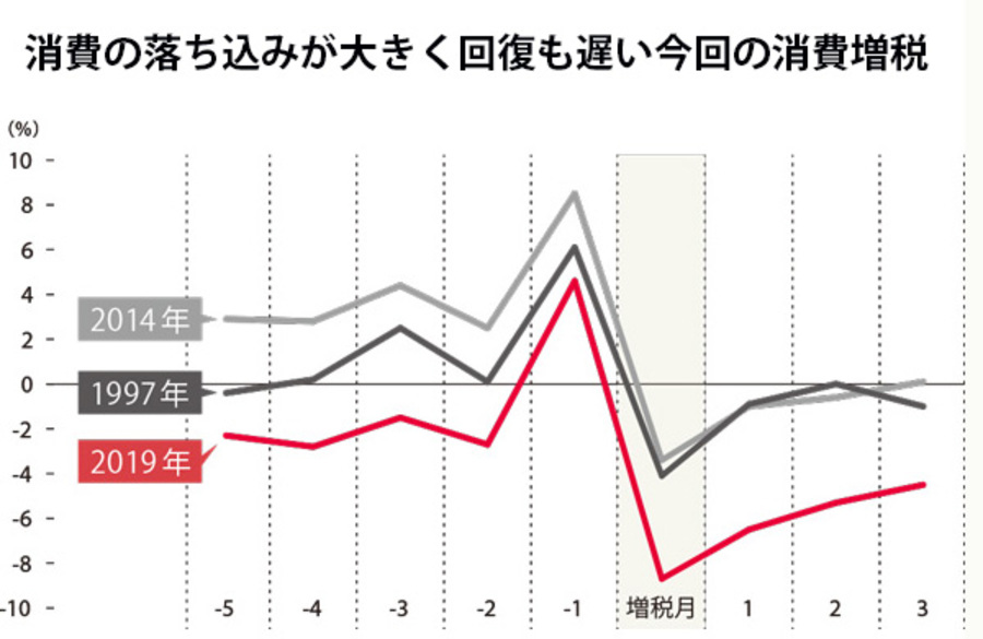 そのインパクトは前回増税時を上回るものであった可能性が高い。前回増税直前の14年1〜3月期には、駆け込み需要と相まって経済成長率は1%(年率4・1%)と比較的良好だった。一方、19年7〜9月期の経済成長率は0・1%(年率0・5%)である。今次の増税後の影響は、駆け込みと反動という側面からの説明が困難だろう。