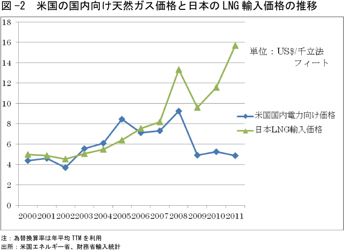 米国の天然ガス市場は、シェールガス生産の影響を受け、大きく下落することになった。2000年からの米国の国内電力向け天然ガス価格と日本のLNGの輸入価格を図-2が示している。シェールガスの生産が本格的に始まる前は米国のスポット価格が、液化費用の必要な日本向けLNG価格より高かった。