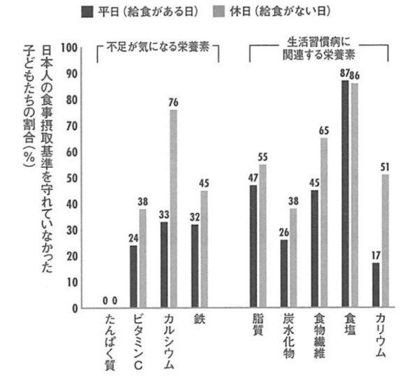 「わずか2~3カ月だし、たいした影響が出るはずがない。心配しすぎだ」と考えたそこのあなた、思い込みは禁物です。実は、東京大学の研究チームが2014年、小中学校の子どもたちの平日と休日の食生活を調べ比較しているのです。学校給食のない休日は、栄養摂取の状況がかなり悪いことがわかっています。