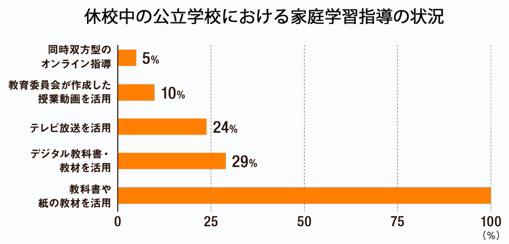 文部科学省は臨時休校を実施する学校の指導について4月16日、全国の自治体に対してサンプル調査を実施した。そこでは全ての自治体が「教科書や紙の教材を活用した家庭学習」を課していると回答した一方で、テレビやICTを活用した「リモート(遠隔)学習」を実施している自治体は少数派であった。具体的には、