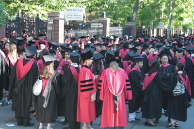 私はチケットを持っていないので会場に入れず、式典の模様は会場近くの自分の研究所でインターネット中継で見た。会場は卒業生や招待客で埋め尽くされ、厳かに式典が始まる。ハーバードの卒業式では卒業生の代表がラテン語でスピーチする恒例行事があるが、男子学生が流暢なラテン語で、ユーモアたっぷりに学生生活の思い出などをスピーチすると、会場に設置された大型のテレビスクリーンに映し出される英語の翻訳をみながら時折、歓声があがっていた。