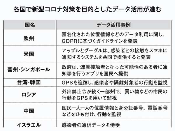 新型コロナウイルス感染拡大防止を目的とした個人データの利用が各国で進む。中国や韓国、台湾などでは、感染者のスマートフォンの位置情報や健康情報が活用されている。米アップルと米グーグルは4月上旬、スマホの「ブルートゥース機能」を利用し、感染者との濃厚接触を検知するシステムを世界各国に共同で提供すると発表した。