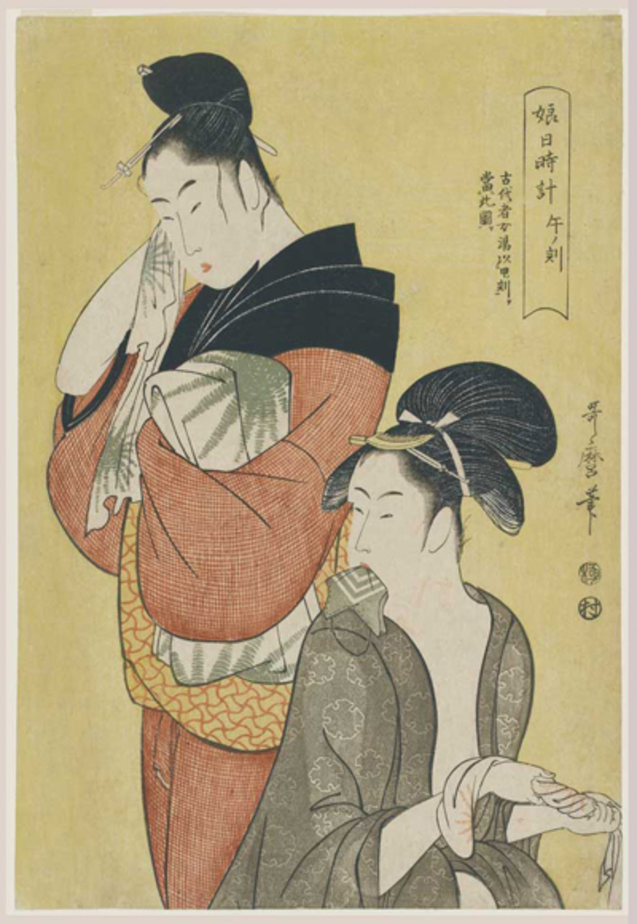 お江戸で美人画といえば、この方、喜多川歌麿さん。その歌麿さんが若い娘さんの生活を写して描いた「娘日時計」5枚シリーズの中の1枚「娘日時計 午(うま)ノ刻(こく)」は、1794~95年(寛政6~7年)頃の作品(1)(2)。午ノ刻とは正午12時を中心とする2時間くらいの時間帯で、正午を境に「午前」と「午後」というように今も使われています。