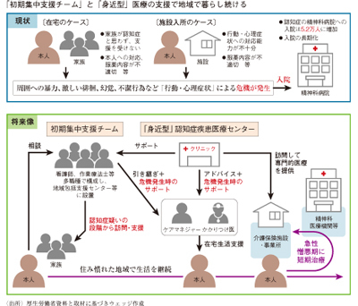 今後の取り組みの核は、「初期集中支援チーム」(以下「初期チーム」)と「身近型認知症疾患医療センター」(以下「身近型」)だ(右図)。