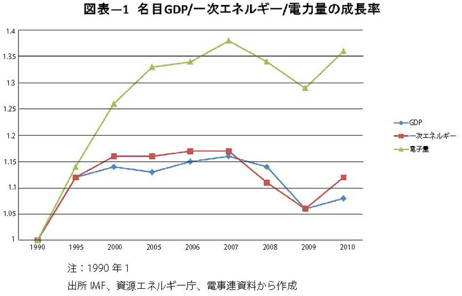 今までの経済成長とエネルギー・電力消費の関係は図表‐1が示す通りだ。経済成長とエネルギー消費には密接な関係がある。電力消費にいたっては1990年代には経済成長の約2倍の伸びを見せている。ウォシュレット、食洗機などの普及に加え、暖房をエアコンで行う家庭が増えたためだろう。