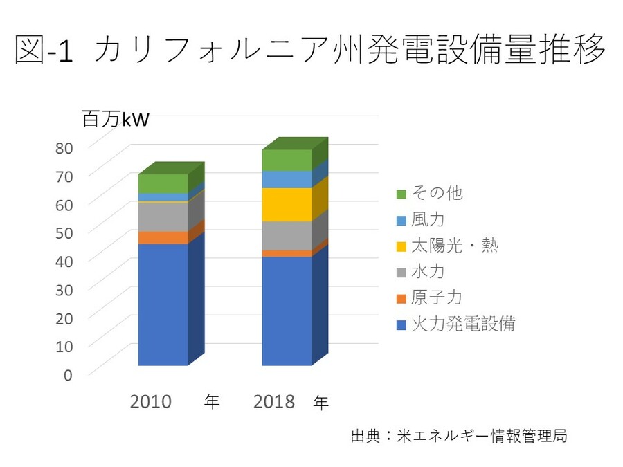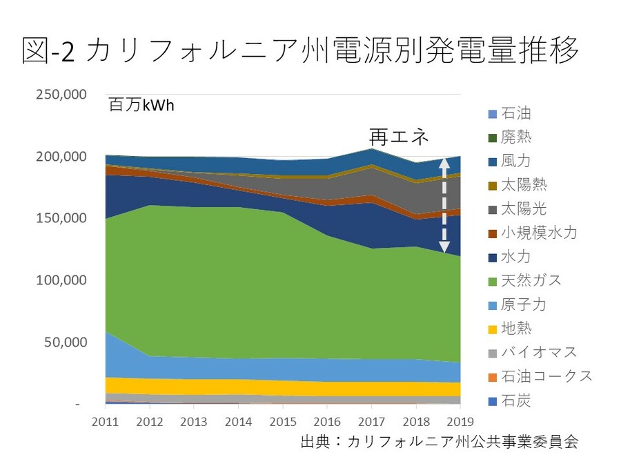 夏の電力最需要期に備える1年の内数週間、あるいは数日しか稼働しない天然ガス火力設備があるが、州政府は低稼働率の火力設備に代え大型蓄電池を導入し最需要時に対応するように電力会社に指示している。同州では風力、太陽光発電設備導入に伴い、石炭火力、天然ガス火力設備の閉鎖が進み、火力設備とその発電量が減少している(図‐1及び図‐2)。