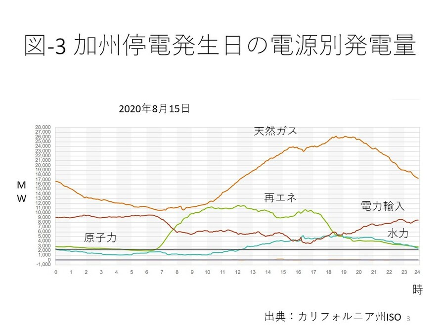 加州の送電管理者は、冷房温度の設定変更、家電製品の使用抑制などの節電を呼びかけたが、8月14日と15日の両日日没後に電力供給が不足する事態となり、輪番停電が実施された。図‐3の通り、日没に伴い再エネからの発電量が急減しているが、この減少分を他の電源でまかなうことができなかった。同州送電管理者は、再エネ導入に伴い天然ガス火力を閉鎖すれば停電の可能性があることは事前に分かっていたと州政府の対応を非難し、ニューサム州知事が準備不足だったと詫びる事態になった。トランプ大統領は、民主党のエネルギー政策は失敗した加州の政策を全国に広げることになるとツイートした。