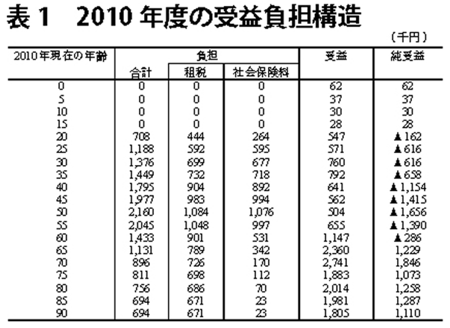 まず、表1により、2010年単年度における年齢階級別の一人当たりの受益と負担構造を見てみる。一般的に、わが国における公的部門を通じた受益・負担構造を見てみると、受益面では、公的年金の受給開始や医療等給付等の社会保障関係による受益が加齢とともに増加する一方、負担面においては、租税や社会保障負担は賃金所得の増加とともに重くなることなどにより、勤労世代において高くなる。つまり、高齢になるほど受益が次第に増していく傾向があることが指摘できる。