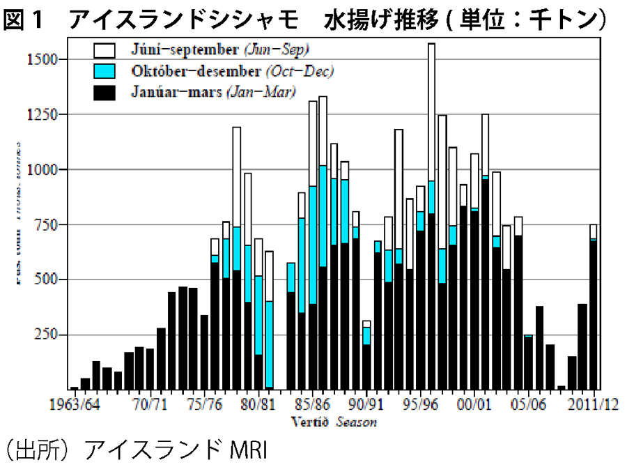 (図1)アイスランドシシャモ 水揚げ推移2009年に資源の減少により調査枠(1.5万トン)のみとした後、資源は再び回復。 (出所:Marine Research Institute アイスランドMRI) 拡大画像表示