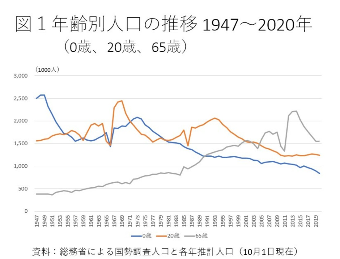ピークは団塊世代の1949年生まれが20歳になった69年(245万人)で、次は第2次ベビーブーム世代が成人になった94年(207万人)だった。その後は減少傾向が続いている(図1)。これに対して、65歳人口は一貫して増加している。第2次ベビーブーム世代が高齢者になる2040年頃までは増加し続けるだろう。