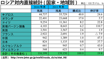 加えて、ロシアとCIS諸国の一部との間に結ばれた租税条約には、投資家に有利な条項があり、キプロスは近年、対ロシア投資の窓口となってきた。キプロスが2004年にEUに加盟した後も、ロシア人資本家は、法人税が低く金融管理も甘い同国にペーパーカンパニーを乱立させ、自国当局の管理や徴税を逃れてきたのである。実際、以下の表からも、キプロスが最大の投資国となっていることは一目瞭然だ。