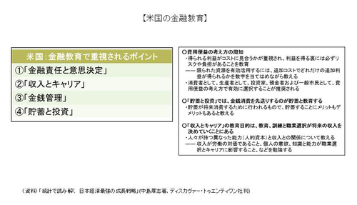 米国をみると、中学校から金融教育でリスク・リターンやコスト・ベネフィットの関係を実践的な形で学んでいく(図表3)。たとえば、得られる利益がコストに見合うかが重視され、利益を得る裏には必ずリスクや負担があることが、「百万長者への道」といったシミュレーションなど具体的事例を通じて教えられる。