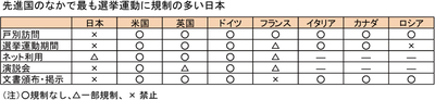 これらの過剰なまでの規制は、結果的に現職に有利に働いてきた。公選法は、特定の候補者への投票行為を勧める「選挙運動」とそれを除く「政治活動」を理論的に区別。選挙運動には具体的に細かく例示して規制をかけ、公示日以降に限定している。一方、政治活動は規制の対象としていない。