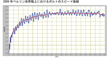 ウサイン・ボルトでさえ、後半失速する。しかし、ボルトがすごいのは、トップスピードが極めて高いことと、失速が少ないことにある。だからレース後半、他の選手を置いて、加速するように見えるのである。ボルトが世界記録を更新した2009年のベルリン世界陸上のレースについて、ドイツ陸連が発表したデータがある。これによれば、ボルトがトップスピードに達したのは70m前後で、秒速12.35m(時速44.46㎞)。驚異的なのは50m過ぎにはすでに秒速12mを超え、ゴールまで12mを下回っていないことにある。3位に食い込んだアサファ・パウエル(ジャマイカ)も好タイムだったが、やはり終盤失速しているのがわかる。