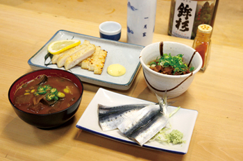 壁に掛かる黒札には白文字で「たまご焼き」「ポテサラ」「湯どうふ」……「うちは凝ったものないんよ(笑)。居酒屋は定番が一番。そやな、夏なら盆汁(ぼんじる)がええんやないかなぁ」と、4代目の森田一也さん。伊勢の「な言葉」が温かい。お盆の時期に出すという夏野菜の味噌汁「盆汁」は、「酒のアテになるように具がいっぱいでな」。品書きを見て気になった「鮫(さめ)のたれ」とは鮫肉の干物。「干すと垂れ下がるから、たれ。昔はお弁当にも入っとったよ」。置いている地酒は大台町の「東獅子(あずまじし)」に久居(ひさい)の「初日(はつひ)」、「これなんか、地元の人はコップ酒でいくな」と、目の前にドンと置かれたのは多気(たき)町の「鉾杉(ほこすぎ)」だ。伊勢のどこかの家庭にあがりこんで飲んでいるようなこの感じ。すでに心は常連である。